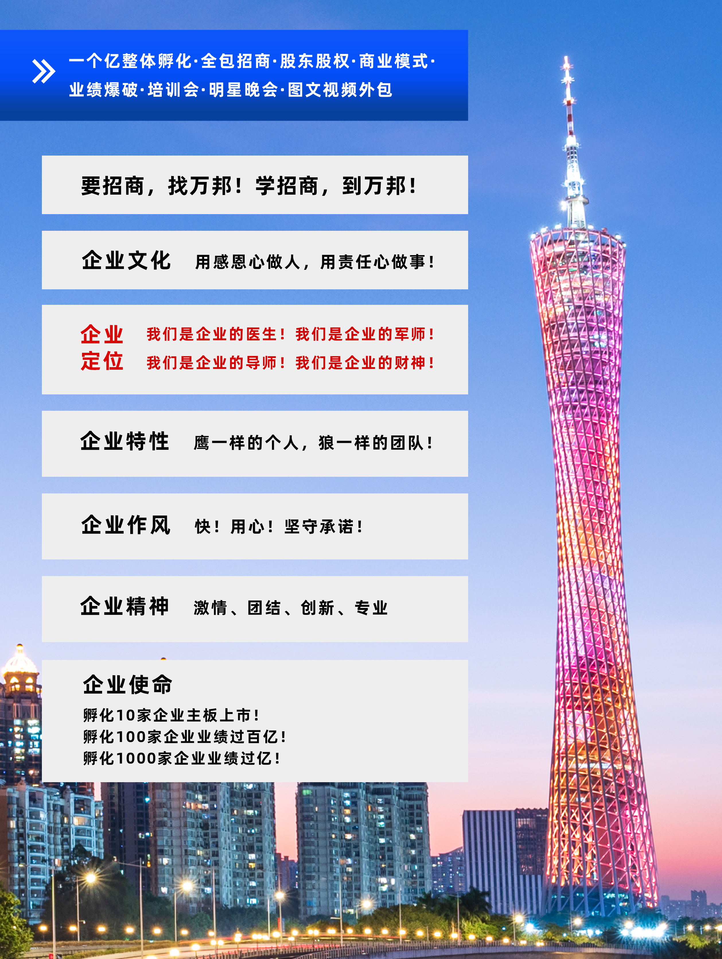 萬邦集團成立于2003年6月,專注于為企業(yè)進行招商和整體孵化,包含公司診斷、產(chǎn)品定位到量身打造商業(yè)模式系統(tǒng),再到投人、投錢、投資源,一起干的分紅股東招募,鐵血軍團的打造,全國招商會議,為企業(yè)建立一套完善;成熟的招商系統(tǒng),教育系統(tǒng)、培訓系統(tǒng)。